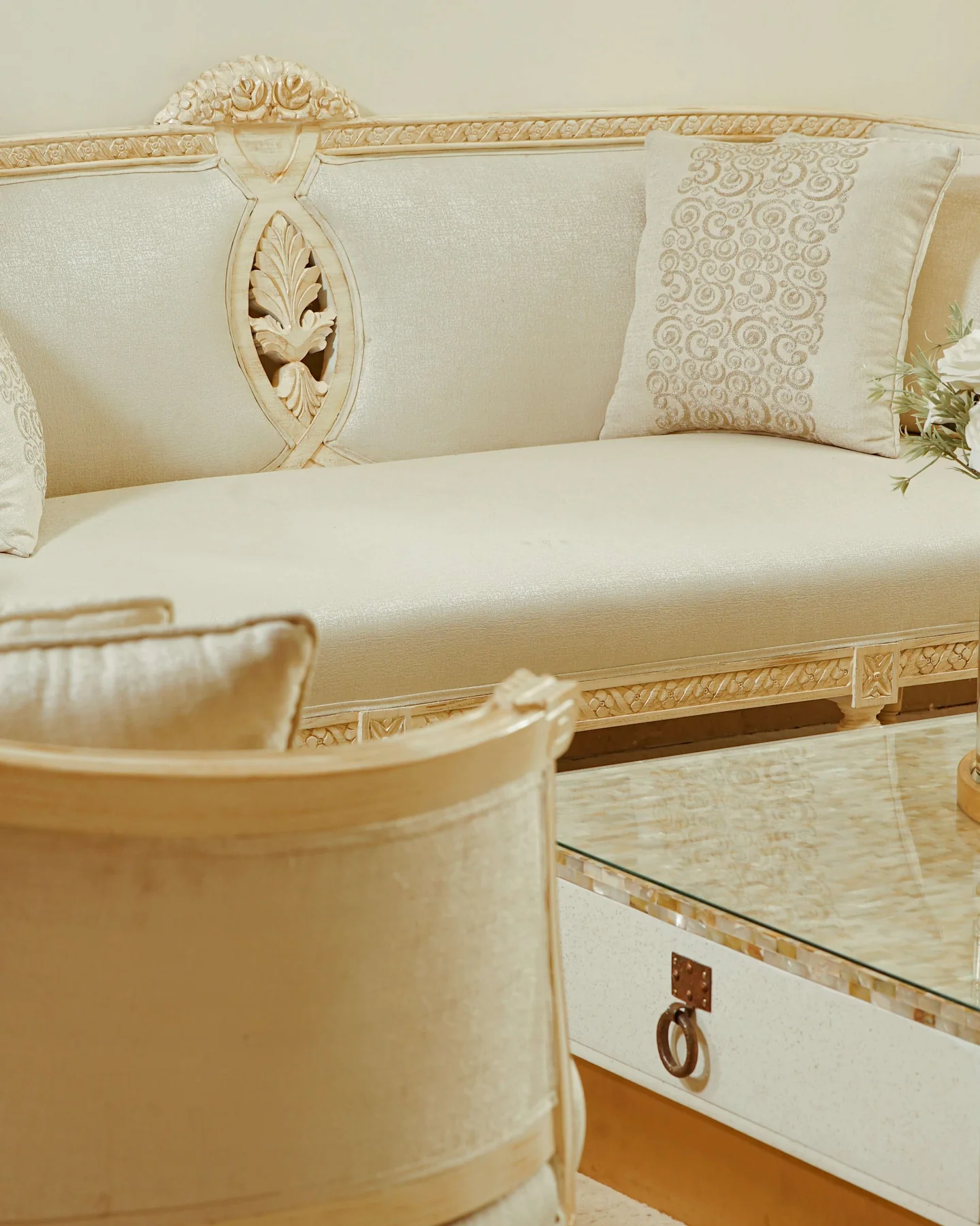 The Glitz Sofa (Motia Finish) by KalaSeek is a statement piece designed to bring glamour and sophistication to your living space. Its Motia (pearl-inspired) finish adds a subtle shimmer that catches the light beautifully, creating an aura of luxury without overwhelming your décor. The sleek, contemporary design ensures comfort while making a bold stylistic impact.